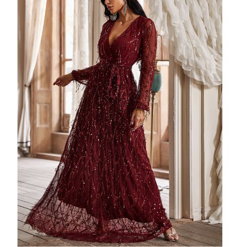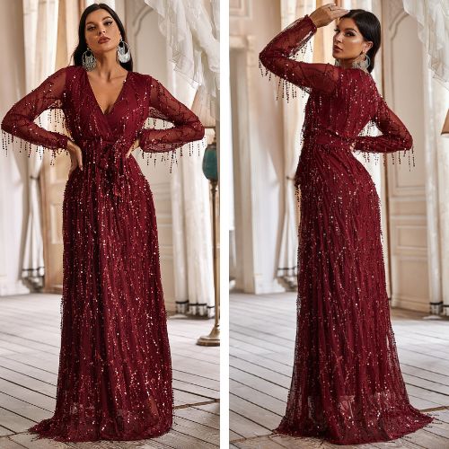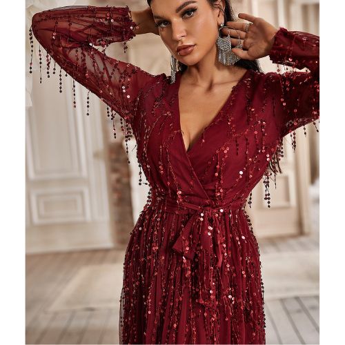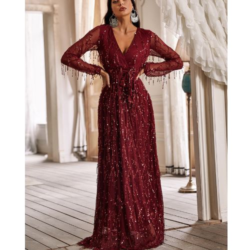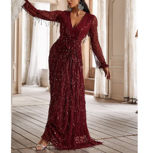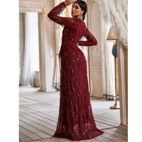 エレガントなスパンコール付きタッセル長袖ディープ